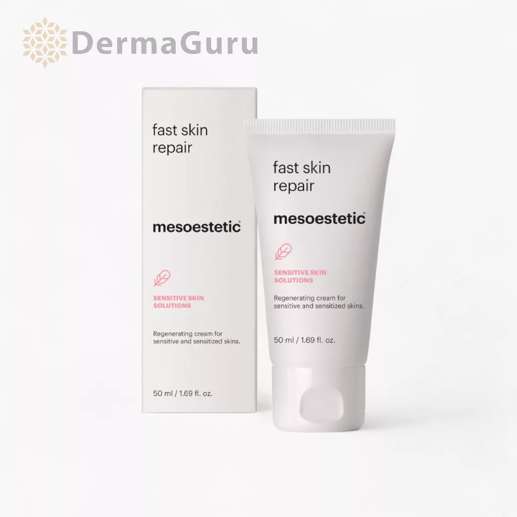 <p><strong>Mesoestetic Fast Skin Repair</strong> este o cremă facială intens calmantă și regeneratoare, dezvoltată special pentru pielea sensibilă, iritată sau după tratamente estetice. Ajută la refacerea epidermei, întărește capacitatea naturală de apărare a pielii și asigură o senzație de confort imediat.</p> <ul> <li><strong>Ingrediente principale:</strong> <ul> <li><em>Pantenol și centella asiatica:</em> susțin procesele de vindecare ale pielii</li> <li><em>Hialuronat de sodiu și uree:</em> hidratează și mențin nivelul de umiditate al pielii</li> <li><em>Acetil tetrapeptid-2:</em> oferă protecție antioxidantă</li> <li><em>Extract de lemn dulce:</em> reduce roșeața și iritația</li> </ul> </li> <li><strong>Ambalaj:</strong> tub de 50 ml</li> <li><strong>Beneficii:</strong> <ul> <li><em>Reduce roșeața, descuamarea și senzația de tensiune</em></li> <li><em>Sprijină regenerarea rapidă a pielii</em></li> <li><em>Întărește stratul protector al pielii</em></li> </ul> </li> <li><strong>Mod de utilizare:</strong> aplicați dimineața și seara pe pielea curățată și uscată. Masați ușor până la absorbție completă.</li> </ul> <p><em>Recomandat pentru toate tipurile de piele, în special după tratamente medicale estetice sau pentru pielea predispusă la iritații.</em></p>